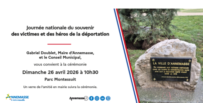 La cérémonie officielle départementale , présidée par Mme la Préfète de Haute-Savoie, sera organisée le Dimanche 26 avril 2026 à 11H au square des Martyrs de la Déportation (clos Bonlieu) à Annecy.