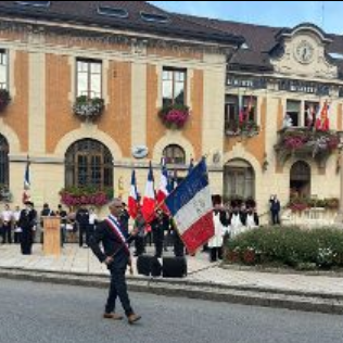 Devant la mairie de Thônes où étaient rassemblés les maires des 17 villes françaises médaillées de la Résistance, M Didier Moncany, Maire de Terrou (Lot) et président de l’Association Nationale des Communes et Collectivités Médaillées de la Résistance Française va remettre le drapeau de l’association au général Christian Baptiste , Délégué National de l’Ordre de la Libération.