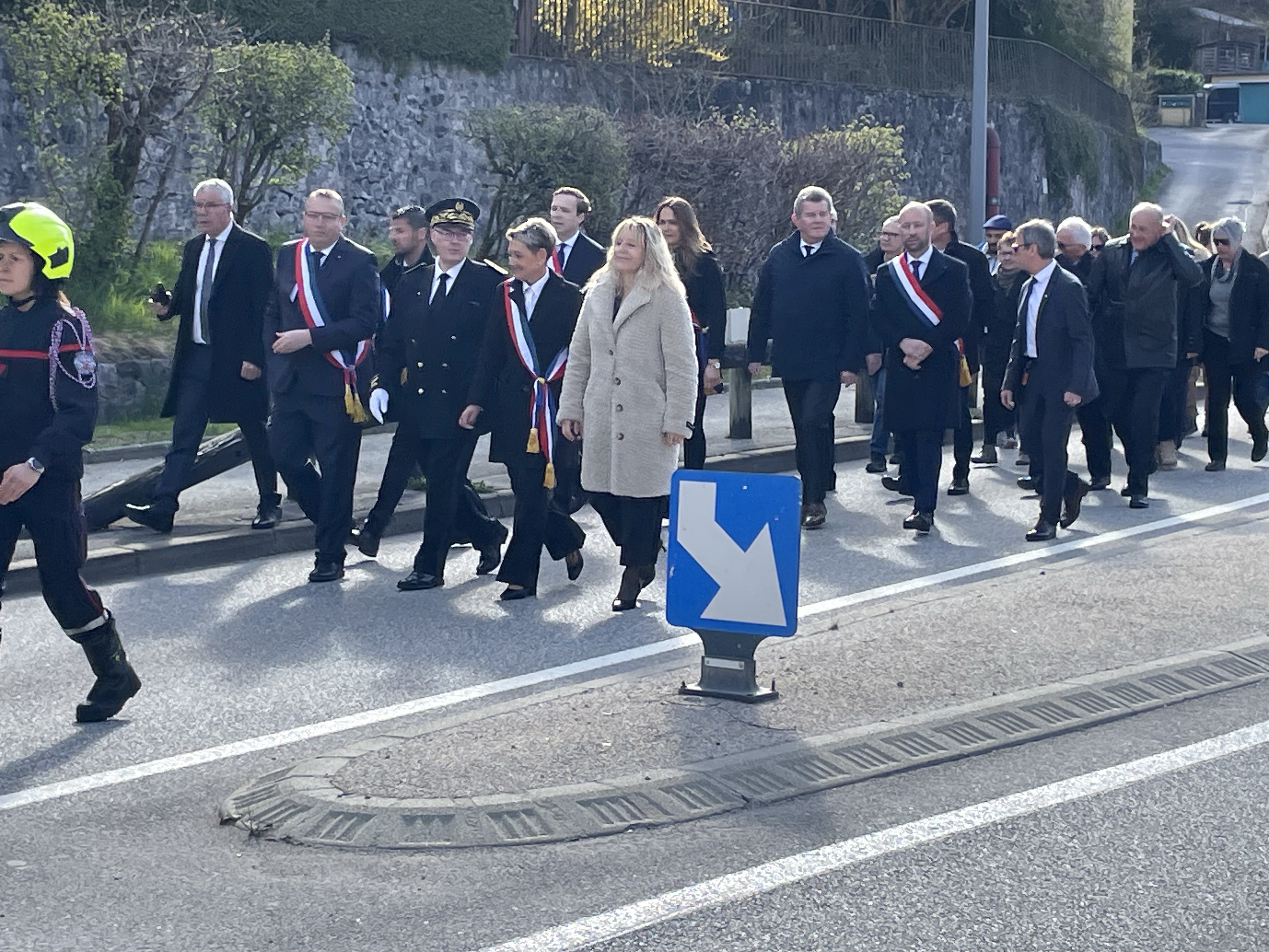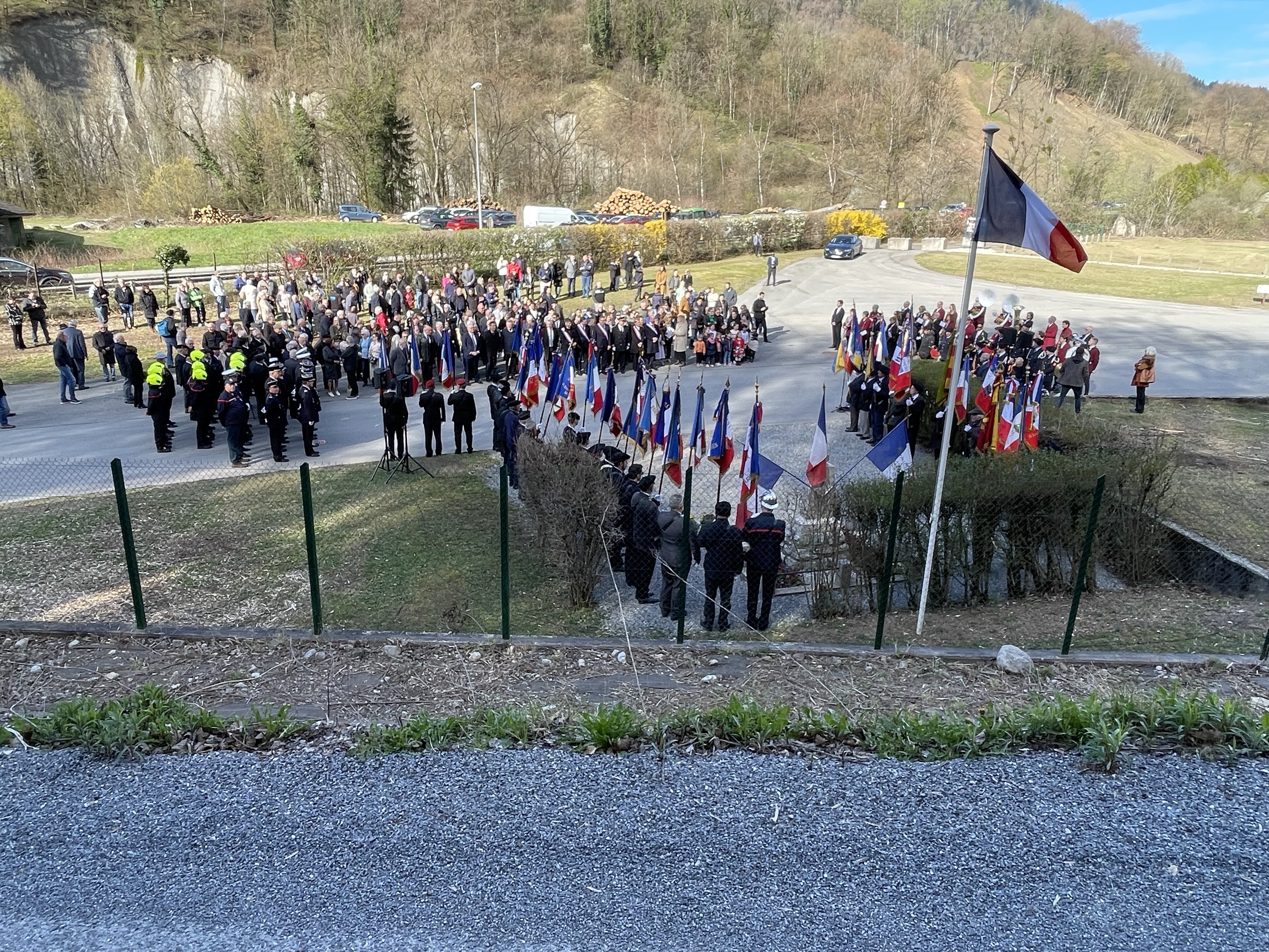 34 drapeaux ont conduit le cortège des participants de l’école à la stèle des fusillés, puis à la stèle Henri Plantaz et au mémorial des Déportés. Devant la stèle , le Président de L’ANACR74 a rappelé l’histoire de la Résistance locale, puis devant le mémorial, ont successivement pris la parole le délégué du souvenir Français , le maire de Marignier , la maire de St-Jeoire. et les élèves de Marignier.