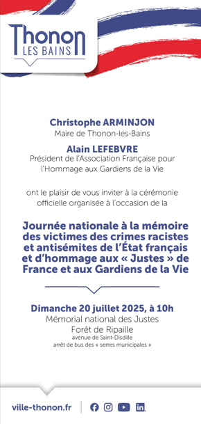 Une cérémonie sera organisée à Annecy 11h et Thonon 10h le dimanche 20 Juillet en mémoire des crimes racistes et antisémites de l’Etat Français.