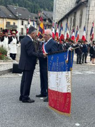 Devant la mairie de Thônes où étaient rassemblés les maires des 17 villes françaises médaillées de la Résistance, M Didier Moncany, Maire de Terrou (Lot) et président de l’Association Nationale des Communes et Collectivités Médaillées de la Résistance Française va remettre le drapeau de l’association au général Christian Baptiste , Délégué National de l’Ordre de la Libération.